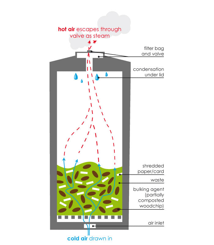- An airtight lid and odour filter to reduce smells associated with attracting vermin and flies